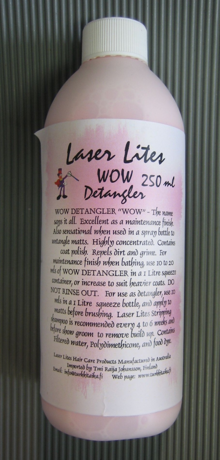 Monitehoinen, antaa kiiltoa. Käytetään harjausnesteenä tai takunavausnesteenä. Mm. likaa ja virtsaa hylkivä. Estää takkujen muodostumista. Näyttelyviimeistelyyn sekä kotona turkin ylläpitoon.Laimennussuhde pesussa n.50 ml tiivistettä 10 ltr vettä. Harjausnesteenä 10 ml tiivistettä 1 ltr vettä. Tuoksuton.