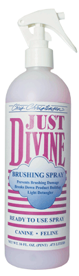 Chris Christensen Just Divine Brushing Spray on kevyt mutta hoitava harjausneste jota voidaan käyttää pesujen välillä harjauksen yhteydessä tai estämään turkin katkeilua näyttelyn jälkeen ennen pesua. Voidaan käyttää kaikenlaatuisiin turkkeihin. Ihanteellinen kevyt, sähköisyyttä poistava viimeistelijä. Ei sisällä silikonia.