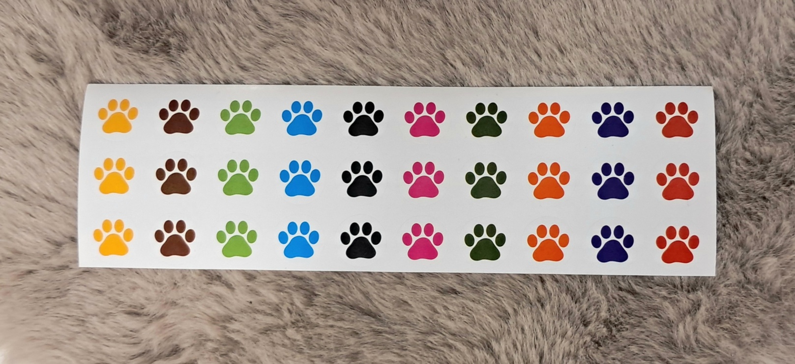 Pieniä värikkäitä tassutarroja valkoisella pohjalla 30kpl, yhden tarran halkaisija 10mm.