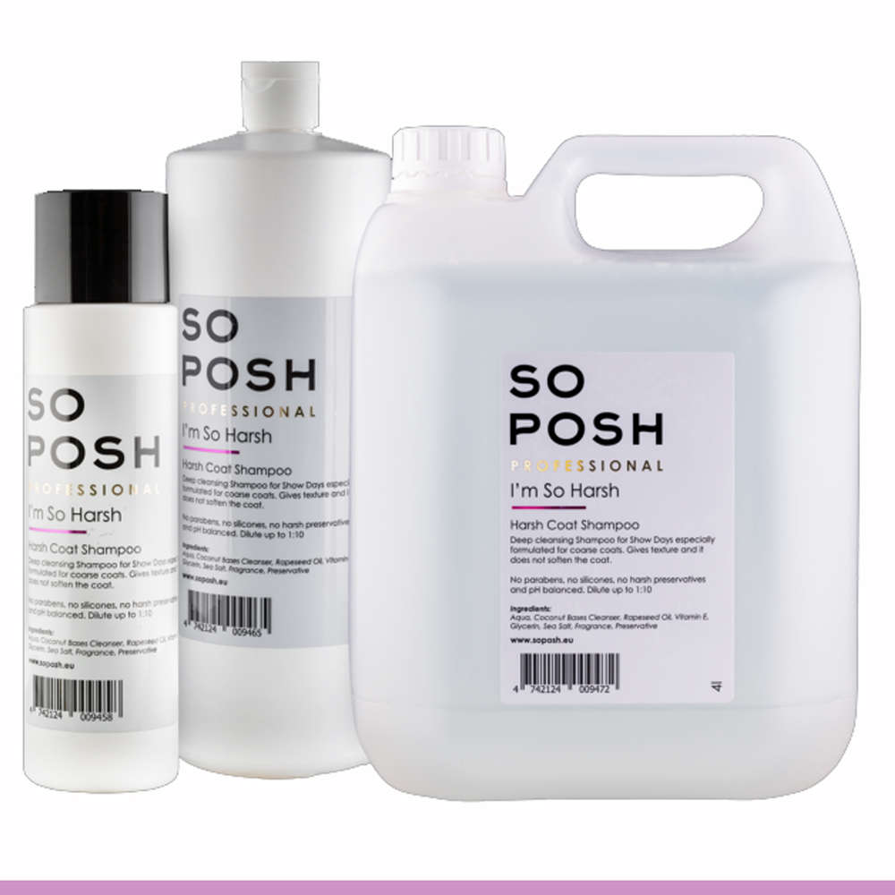 SO POSH I'm SO Harsh shampoo karkeakarvaisille turkinlaaduille. I'm So Harsh Shampoo on syväpuhdistava shampoo jota käytetään mm. näyttelypesuihin ja joka on erityisesti suunniteltu karkeakarvaisten rotujen turkeille. Antaa tekstuuria ja ei pehmennä koiran turkkia.