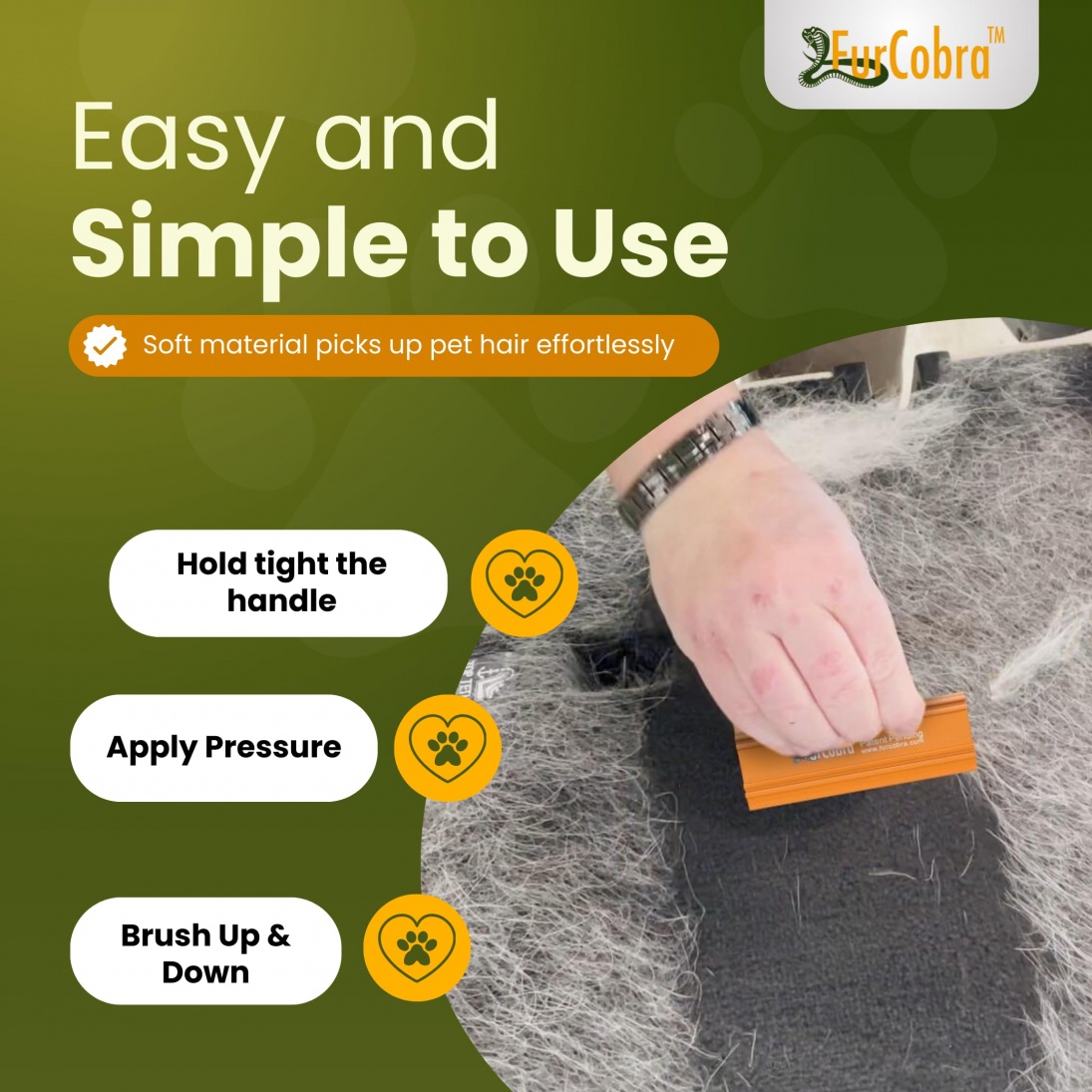 Fur Cobra Pro:navulla poistat lemmikkien karvat tehokkaasti monilta eri pinnoilta. Tämä tuote sopii erinomaisesti auton verhoilun sekä kodin huonekalujen, kuten sohvien ja lepotuolien, puhdistukseen. Fur Cobrassa on kestävä DuraFric™-rakenne, joka irrottaa karvat hämmästyttävän tehokkaasti kodin eri pinnoilta! FurCobra Prossa on patentoitu muotoilu, jossa on Triple Pressure Blade (TPB) lyhyille karvoille ja Double Friction Blade (DFB) pehmeille ja ohuille karvoille.